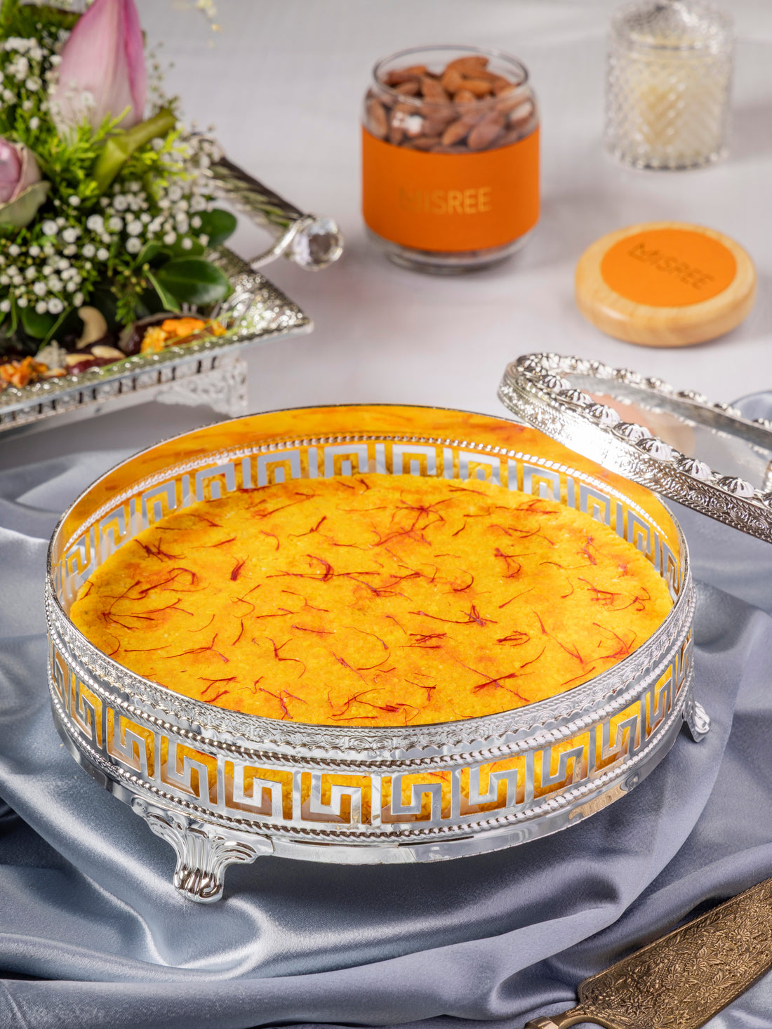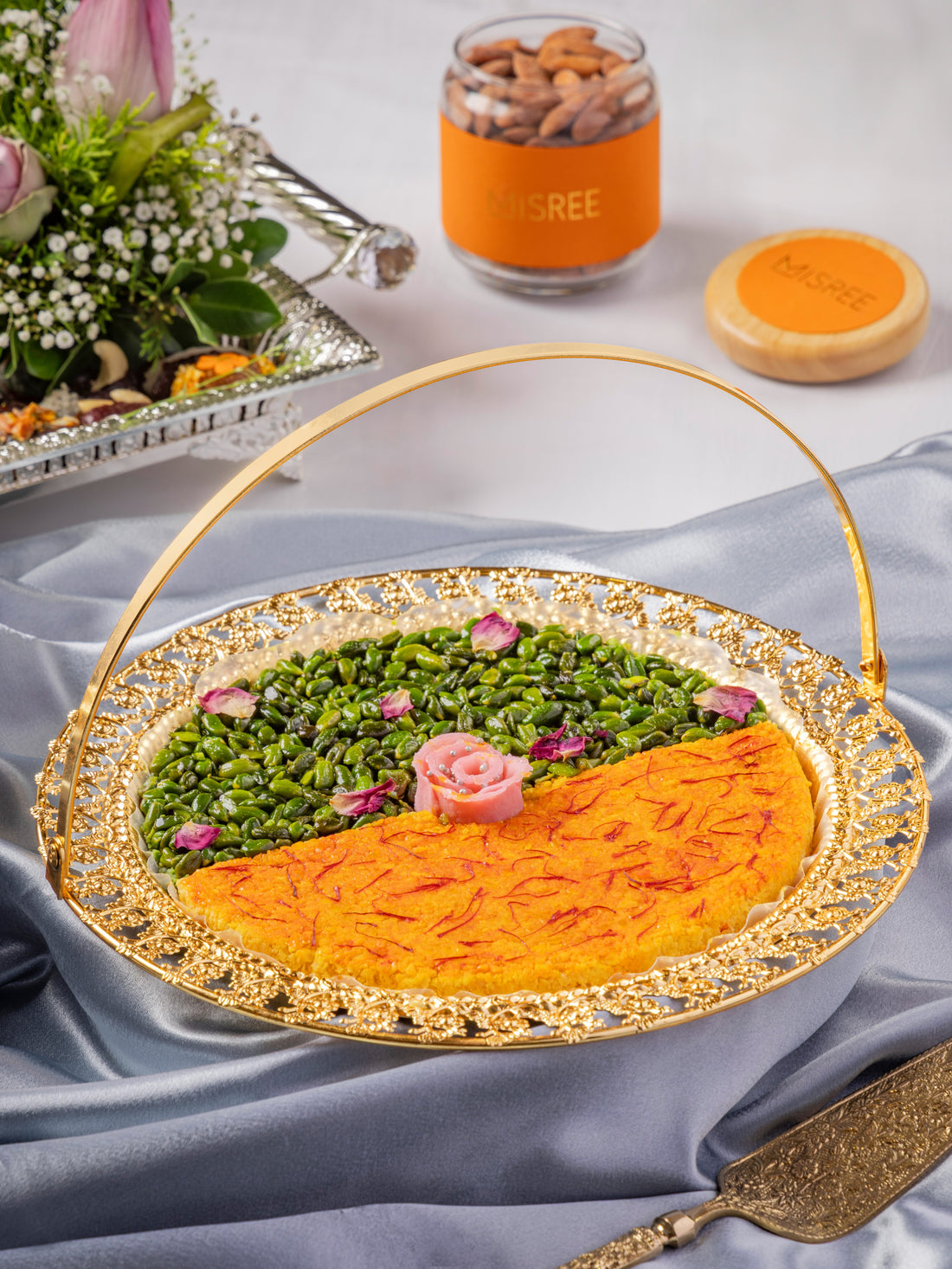 An opulent collection of Misree’s signature cakes, elegantly set in a golden tray. From butterscotch...