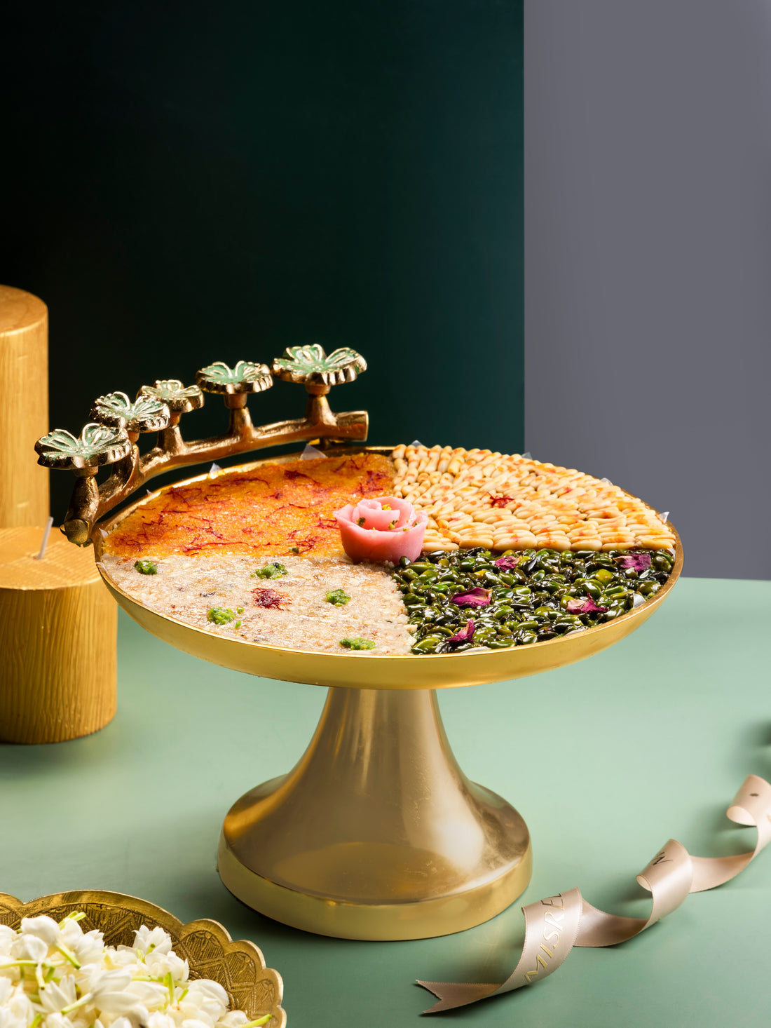 Savor the heritage of our Muradabadi Cake Tray, featuring an exquisite selection of traditional mithai...