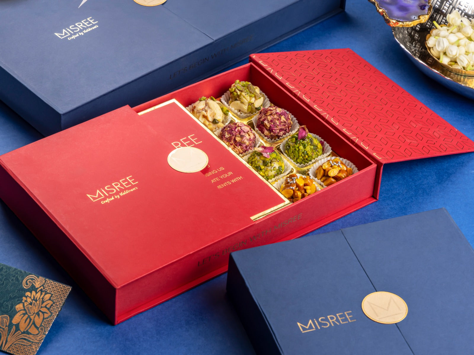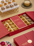 A festive assortment of 16 premium sweets, this box features a delightful mix of rich Kaju Kesar and traditional Besan Burfi. Thoughtfully packed and perfect for celebrations, it’s a gift that brings together indulgence and elegance in every bite.