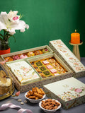 Celebrate with grace through our Floral Tray Hamper, featuring 16 premium sweets, a savoury selection, and five indulgent 70 g laddoos. Beautifully arranged on an elegant floral tray, it’s a perfect choice for festive gifting or marking life’s sweetest moments.