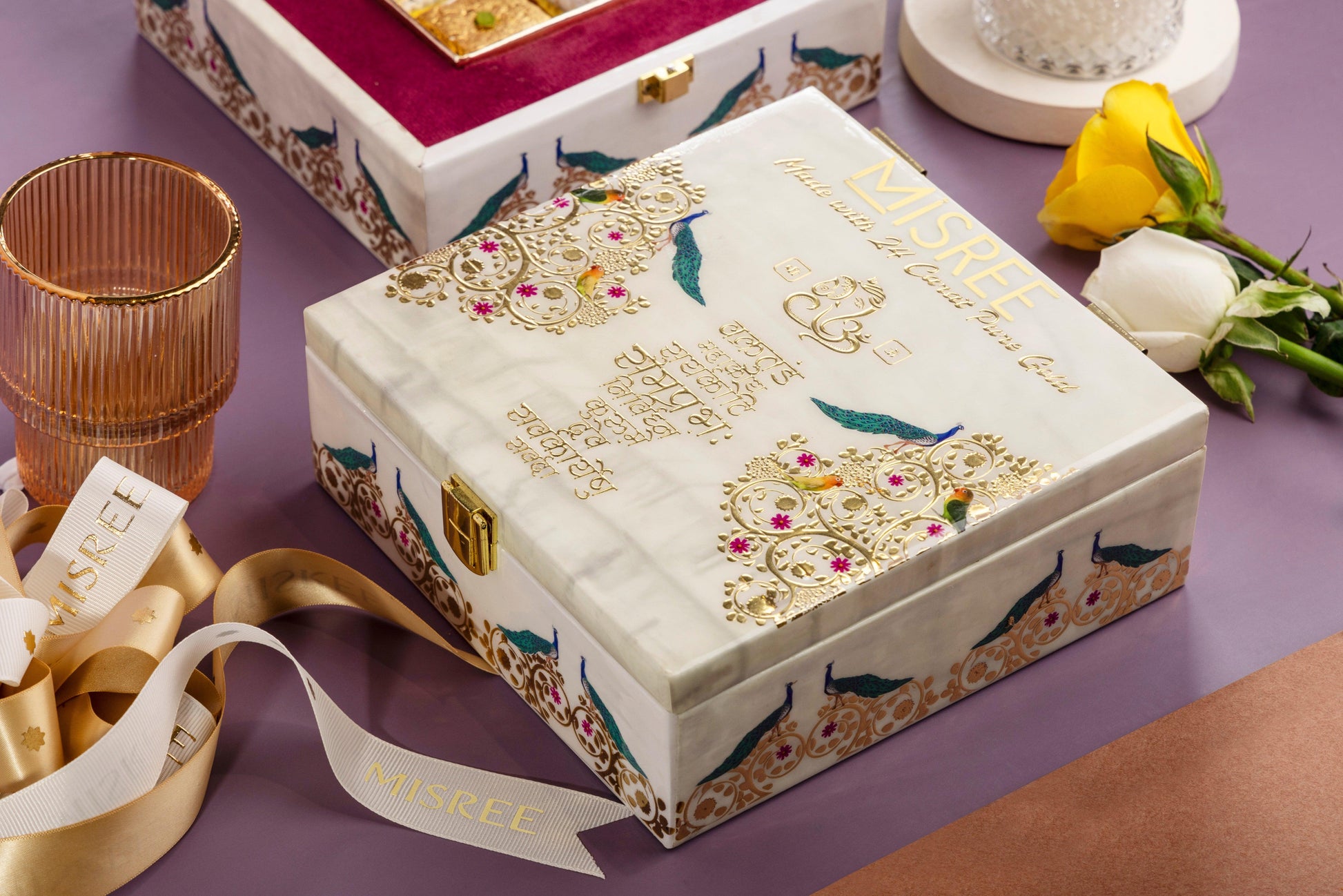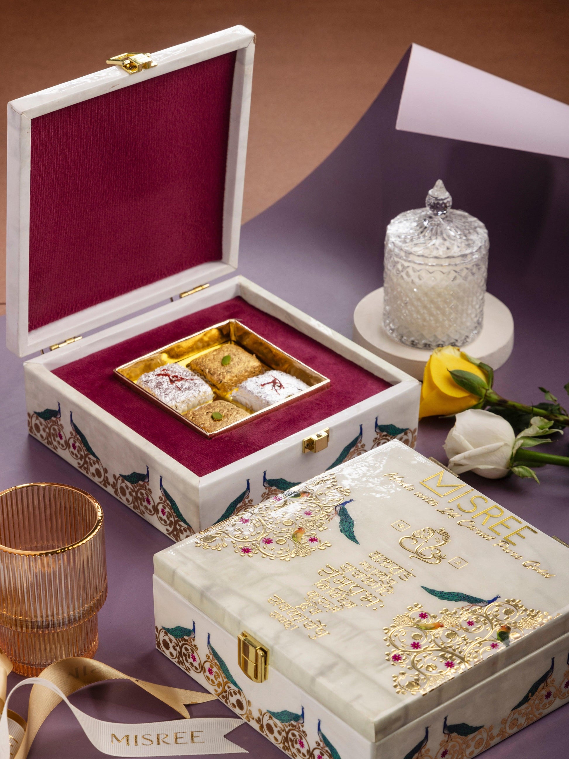 But our limited edition box is more than just a collection of exquisite sweets. It is a testament to craftsmanship and tradition, with each piece carefully placed within a meticulously designed box. Adorned with intricate patterns and inscribed in 24-carat gold writing, the box bears the sacred mantra of Lord Ganesh, invoking blessings for new beginnings and opportunities with every serving.