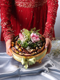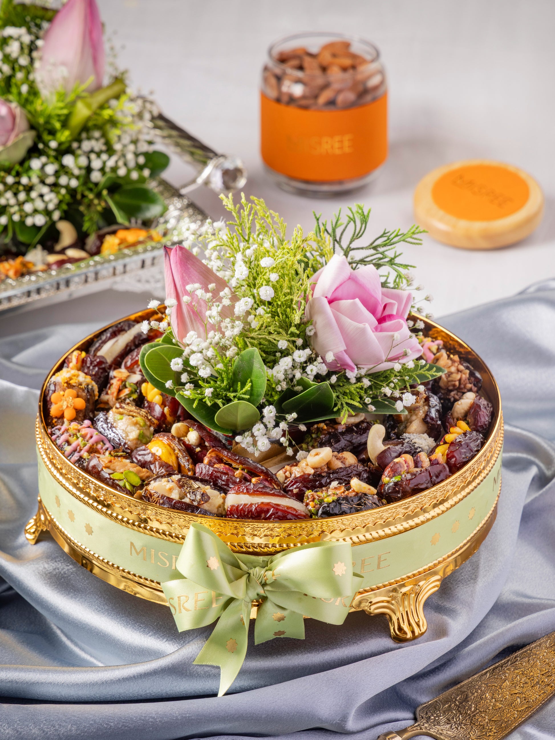 Rich in taste and tradition, the golden floral tray offers a luxurious assortment of fine dates. Wrapped in festive charm, it’s the perfect pick for heartfelt gifting and joyous occasions.
