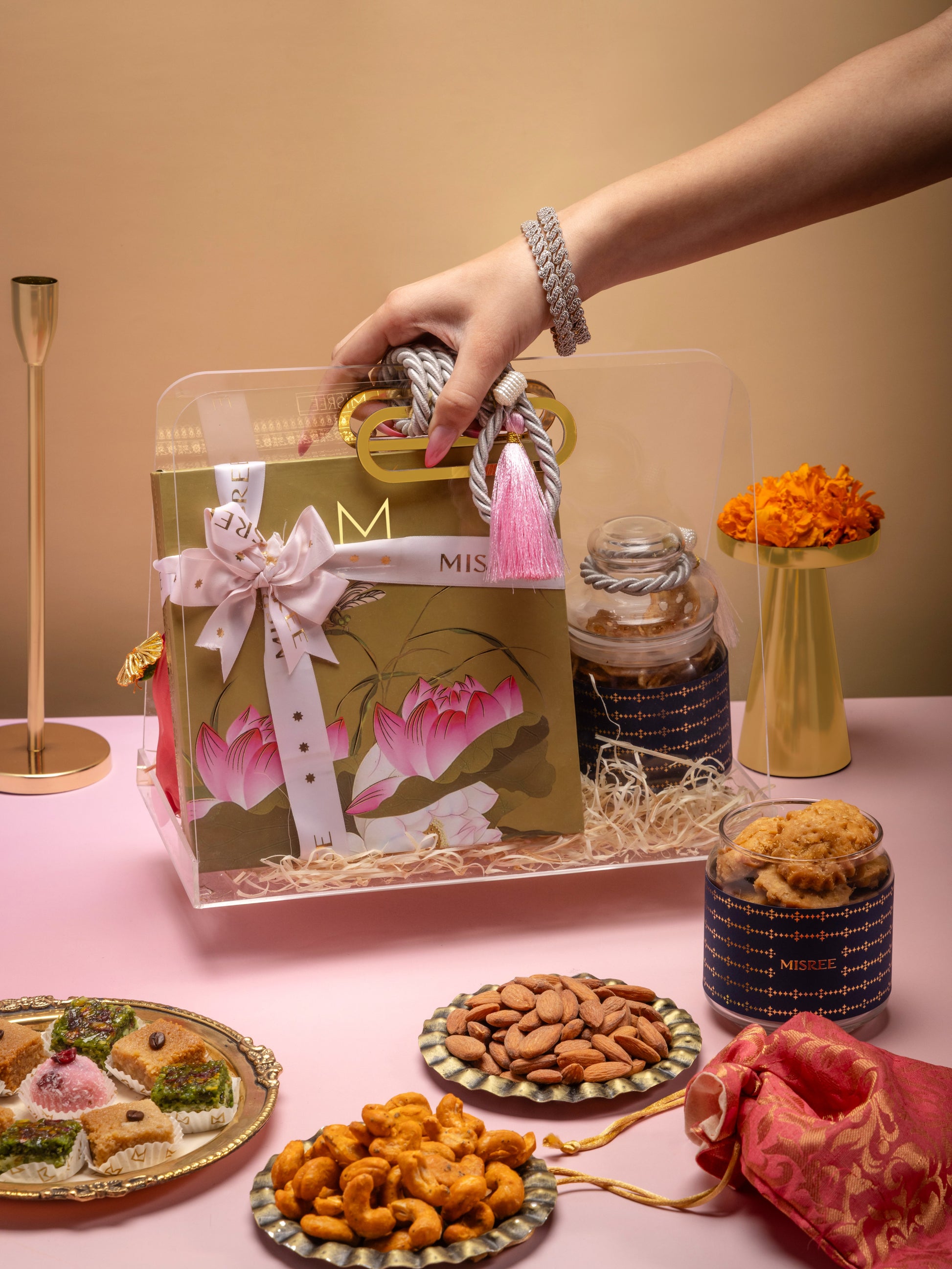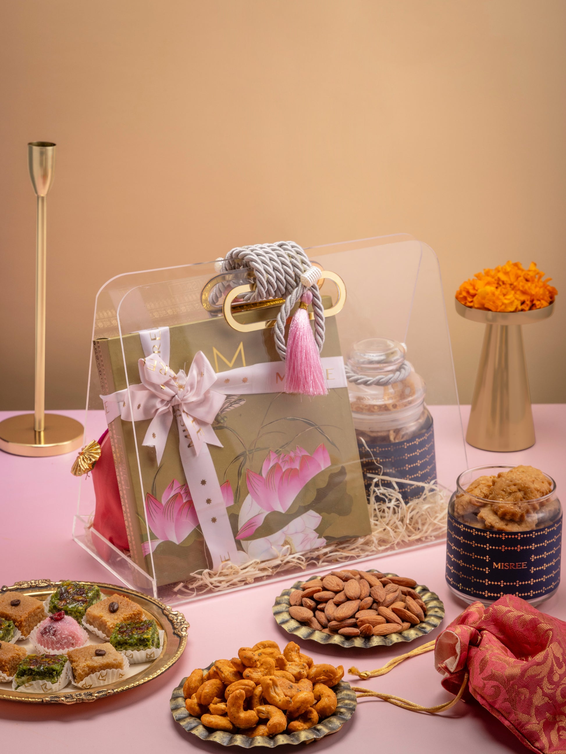 Elevate your gifting with our Misree Acrylic Hamper, featuring an elegant assortment of premium sweets, savouries, and dryfruits. Crafted in a sleek acrylic design, it offers a modern touch of luxury—perfect for festive occasions and sophisticated celebrations.