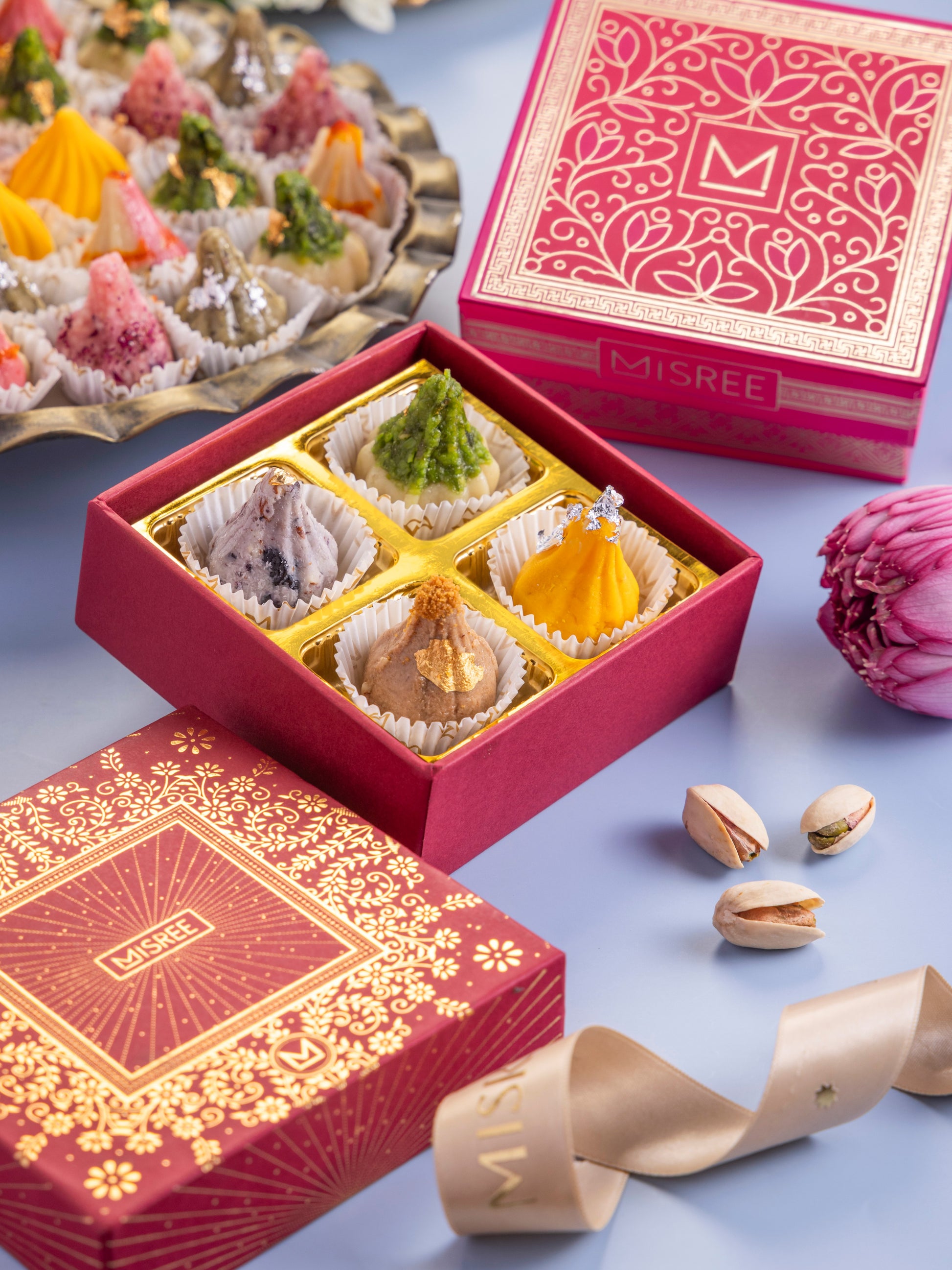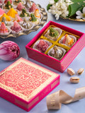 A charming gift option, the Modak Box of 4 is presented in a beautifully designed pink and magenta box. Inside, it holds four pieces of premium handcrafted Modaks in assorted flavors, perfect for small yet thoughtful gifting. Ideal for return gifts, festive offerings, or a sweet personal indulgence, this compact box carries elegance and tradition in every bite.