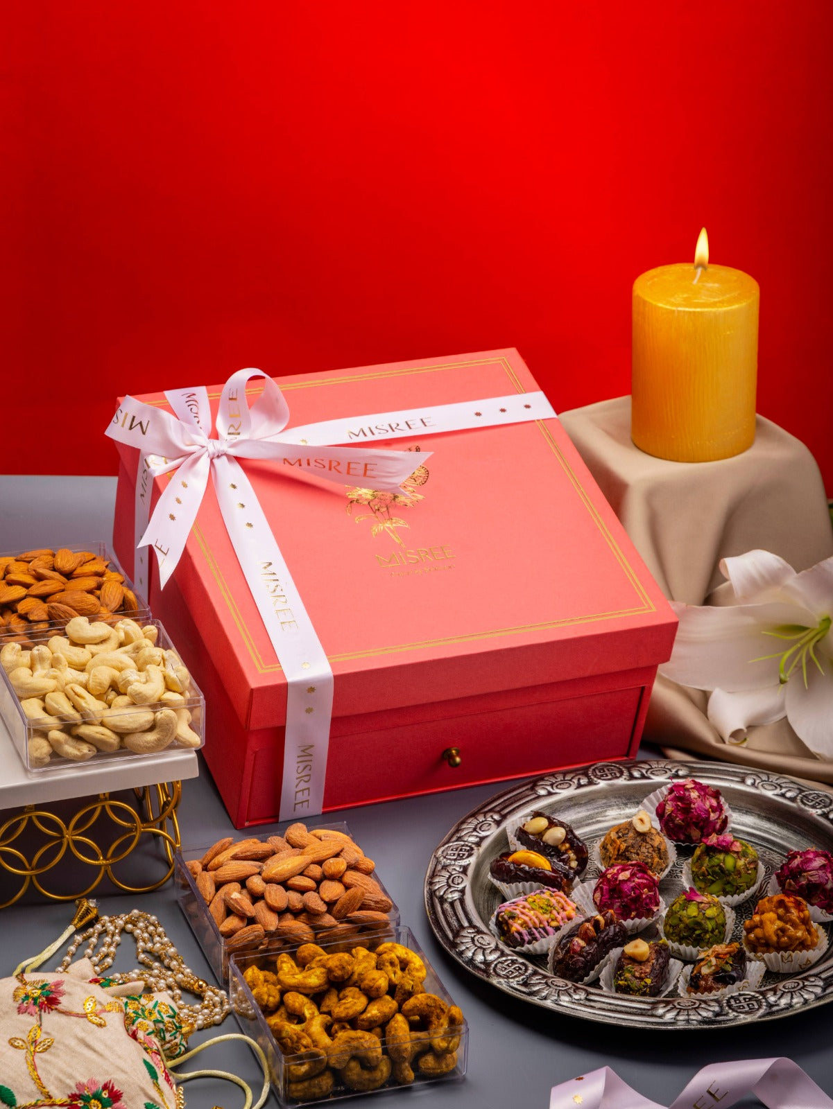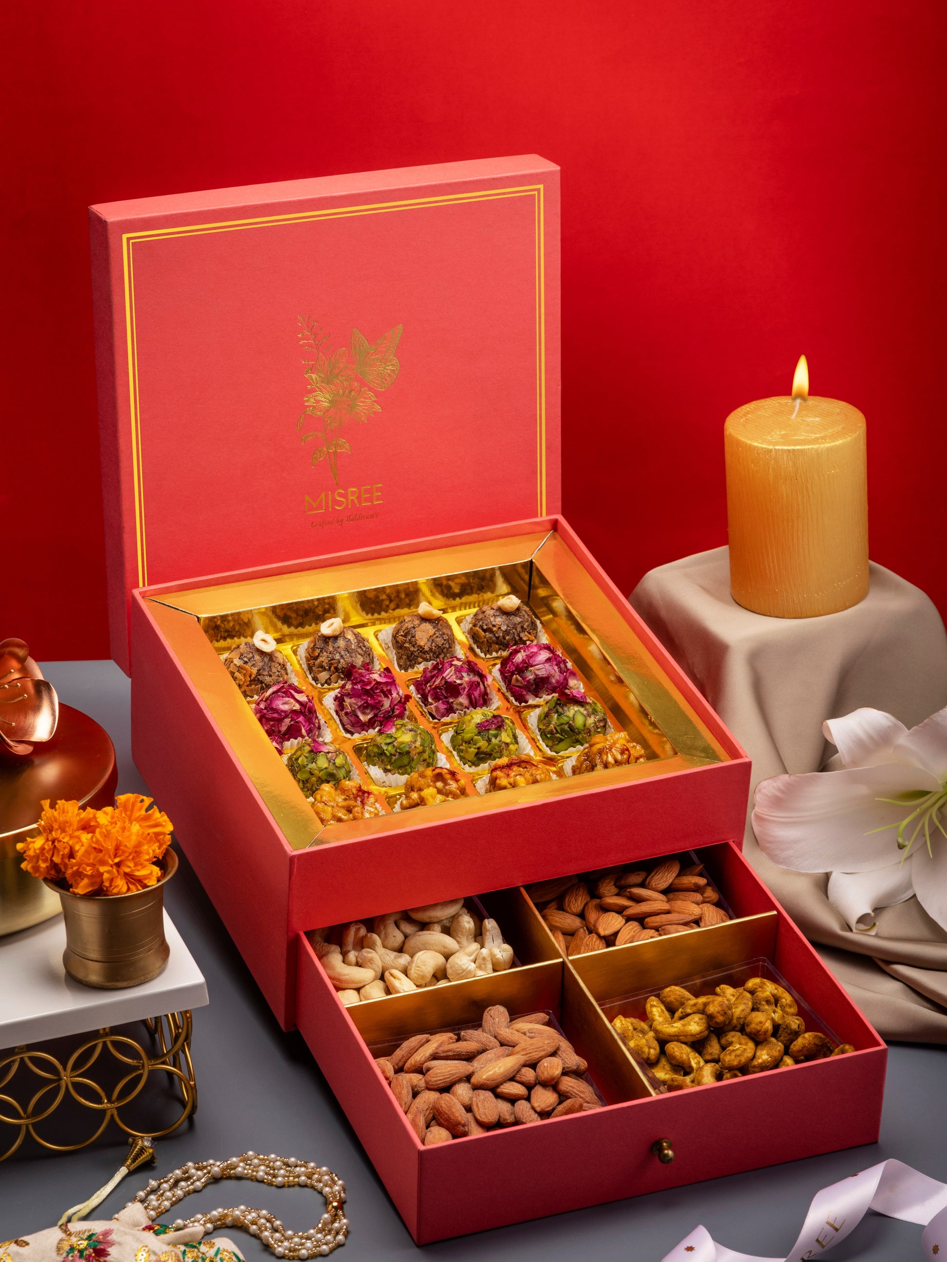 Savor the art of fine gifting with our Nalini Hamper, featuring 16 exquisite sweets paired with your choice of four premium dry fruits or savouries. Elegantly presented, it’s crafted to celebrate every occasion with refined taste and timeless charm.