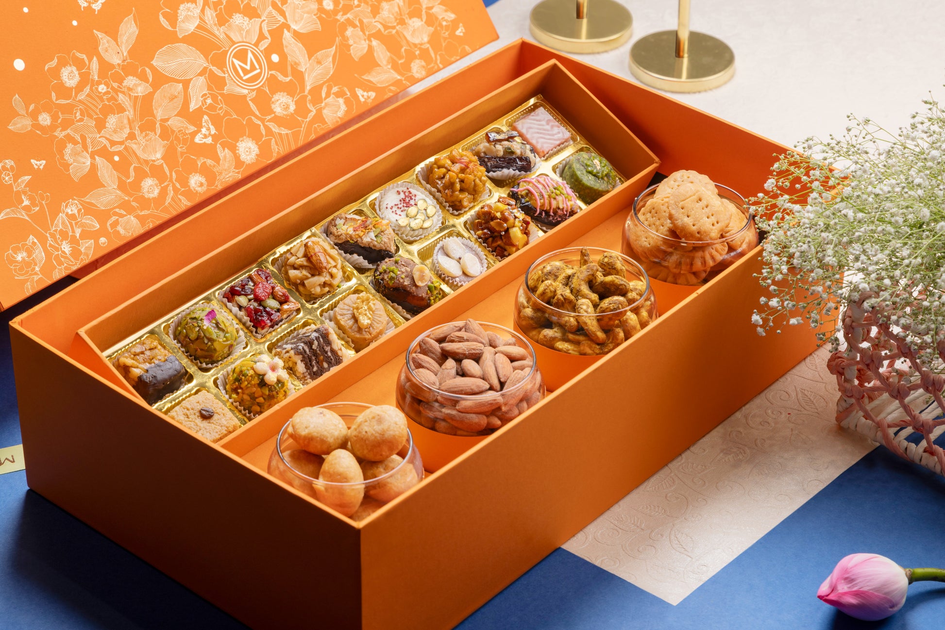 The Orange Sweet Hamper Box is a delightful combination of sweet and savory indulgence. It features 18 pieces of assorted premium sweets, each crafted to perfection with rich flavors that will captivate your taste buds. The hamper also includes two jars of savory treats, adding a delightful crunch to your experience, and two jars of premium nuts, perfect for a healthy yet indulgent snack. Packaged in a vibrant orange box, this hamper makes for an ideal gift, offering a thoughtful blend of flavors for any celebration. Available for delivery across India.