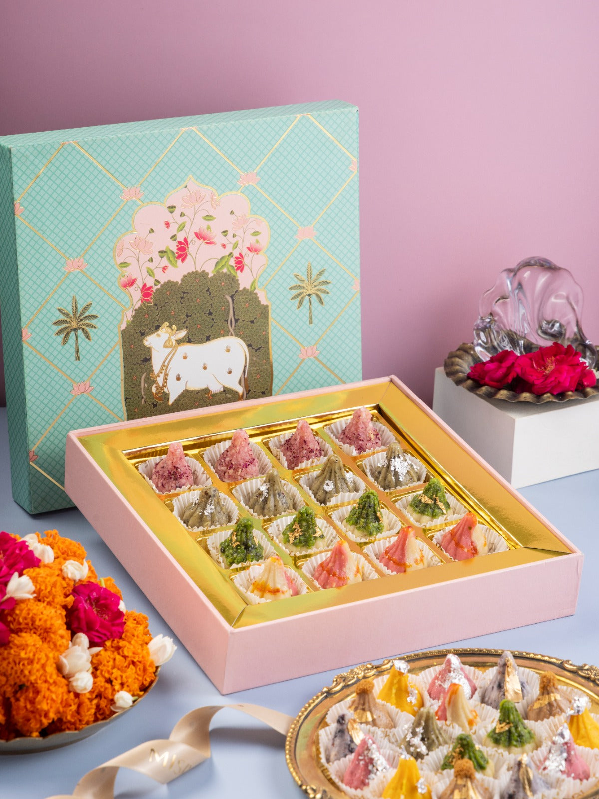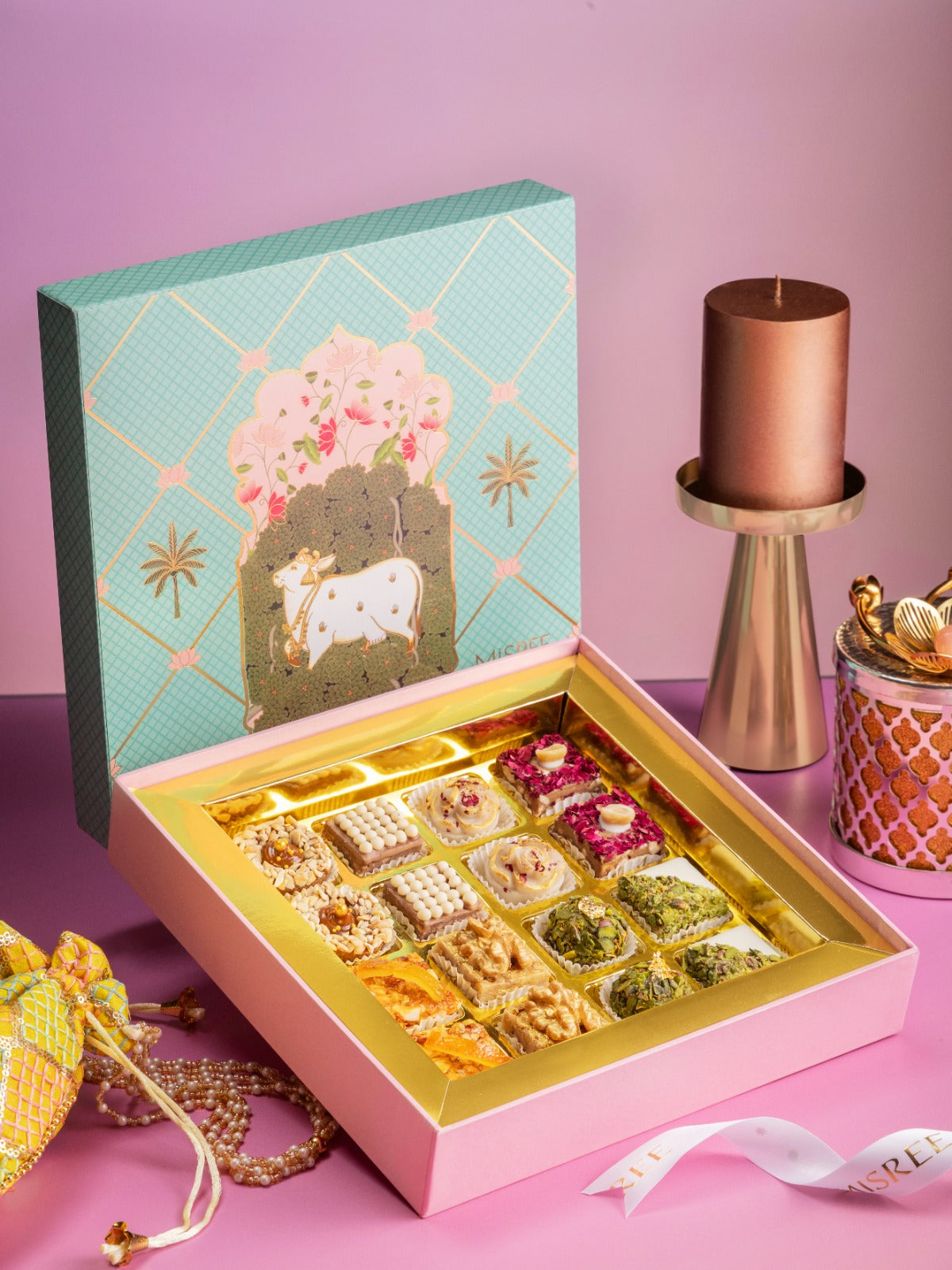Celebrate tradition with our Pichwai Naitee Box, featuring a beautiful motif inspired by Pichwai art. This curated selection of premium sweets is housed in a uniquely designed box, perfect for gifting or personal indulgence. Customize your box with our most exquisite offerings, making every celebration truly special.
